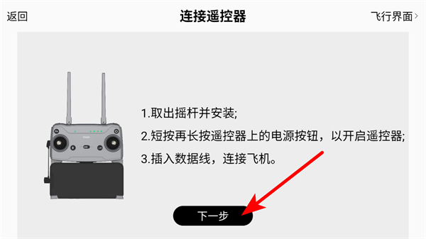 2.按照提示連接遙控器:取出搖桿并安裝,短按再長按遙控器電源按鈕開啟遙控器,插入數(shù)據(jù)線連接飛機,點擊下一步。