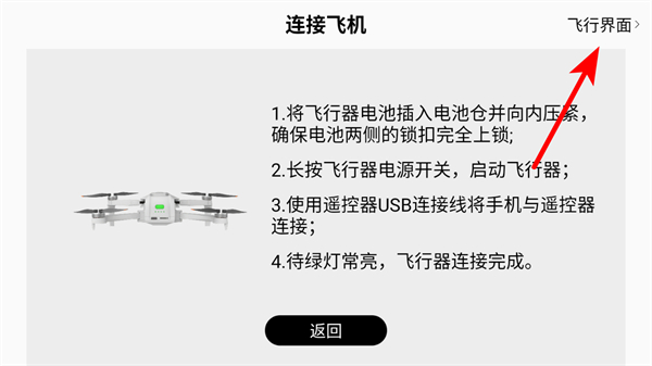 3.長按飛行器電源開關(guān)啟動飛行器,用遙控器USB連接線將手機與遙控器連接,待綠燈常亮后點擊飛行界面。