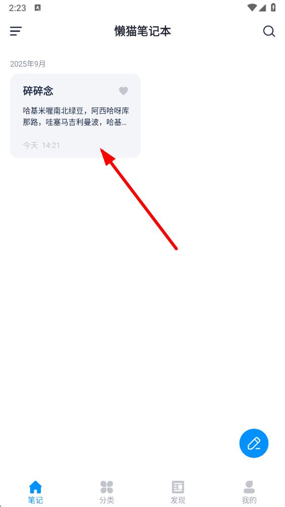 1、打開懶貓筆記本app,在筆記頁面中,點(diǎn)擊需要?jiǎng)h除的筆記內(nèi)容。