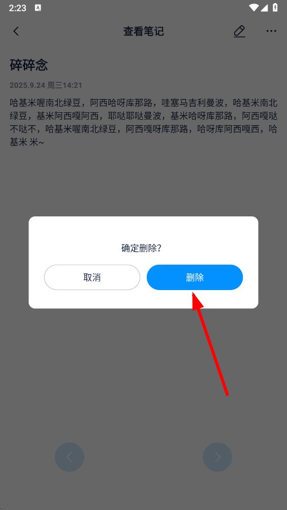 4、在彈出的確認(rèn)提示框中,點(diǎn)擊刪除按鈕,即可成功刪除該筆記。