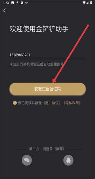 4、填寫好手機號后點擊獲取驗證碼按鈕后,輸入收到的短信驗證碼,即可完成賬號登錄流程。