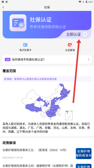 2、在社保頁面里,按照箭頭指示點擊立即認證,開始認證操作。