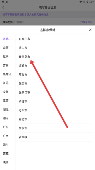 3、通過選擇點擊秦皇島市為參保地,選擇完后繼續(xù)下一步驟。