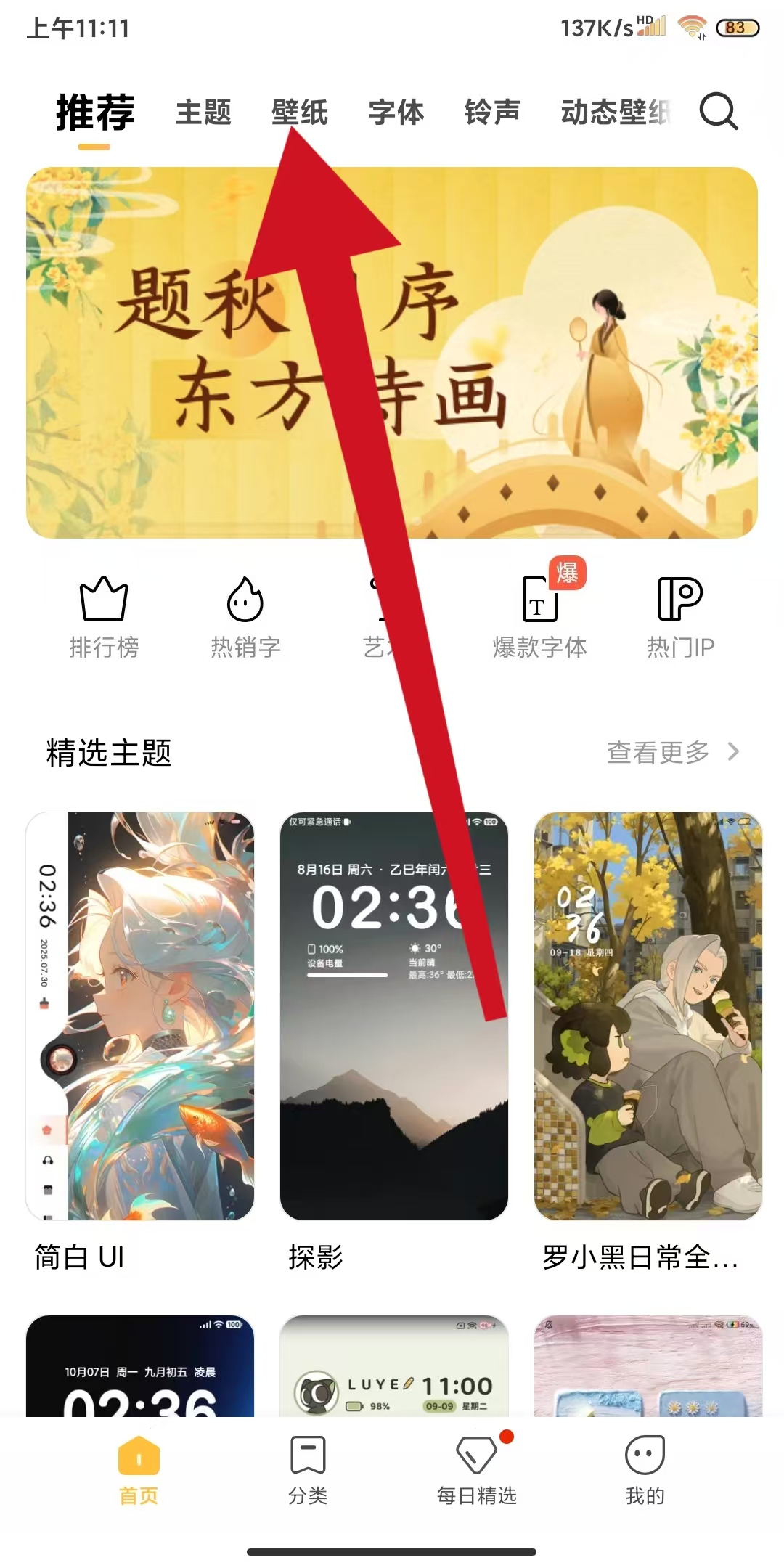 2、進入主題壁紙應用后,點擊上方菜單欄中的壁紙選項。