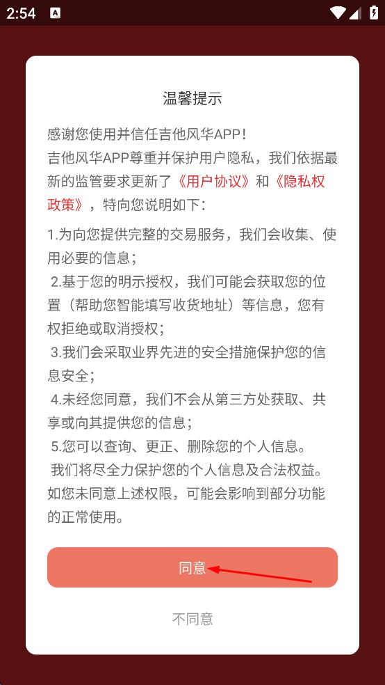 1、打開吉他風華,彈出溫馨提示,點擊同意,進入軟件首頁。