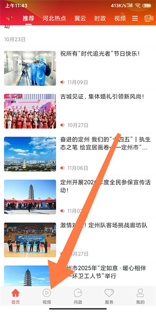 1、在冀云定州app首頁(yè),點(diǎn)擊底部視頻選項(xiàng),進(jìn)入視頻頻道頁(yè)面。