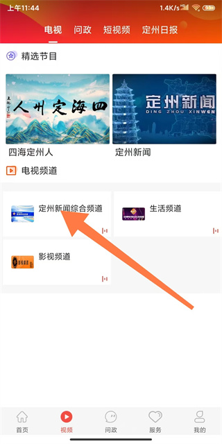 2、在視頻頻道頁(yè)面,點(diǎn)擊定州新聞綜合頻道選項(xiàng),進(jìn)入頻道詳情界面。