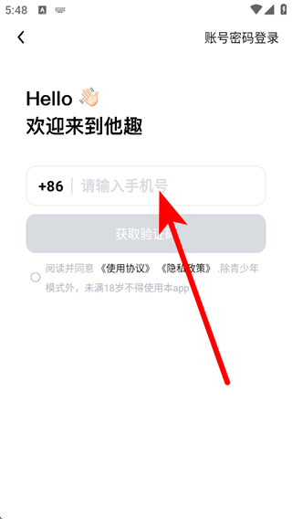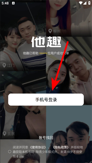 1.打開(kāi)他趣APP,點(diǎn)擊手機(jī)號(hào)登錄按鈕。