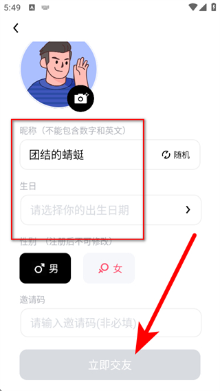 4.若為新用戶(hù),需設(shè)置昵稱(chēng)、生日、性別,點(diǎn)擊立即交友即可完成登錄并注冊(cè)。