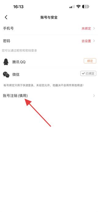 4、在賬號(hào)與安全頁(yè)面點(diǎn)擊賬號(hào)注銷(xiāo)慎用,按照提示完成賬號(hào)注銷(xiāo)流程即可。