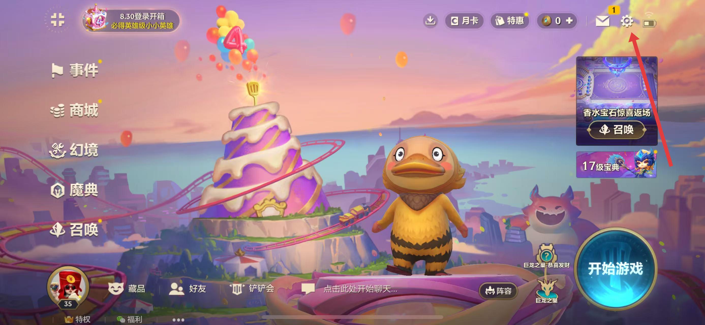 1、打開金鏟鏟之戰(zhàn)游戲,在主界面點擊右上角的設(shè)置圖標,進入設(shè)置頁面。