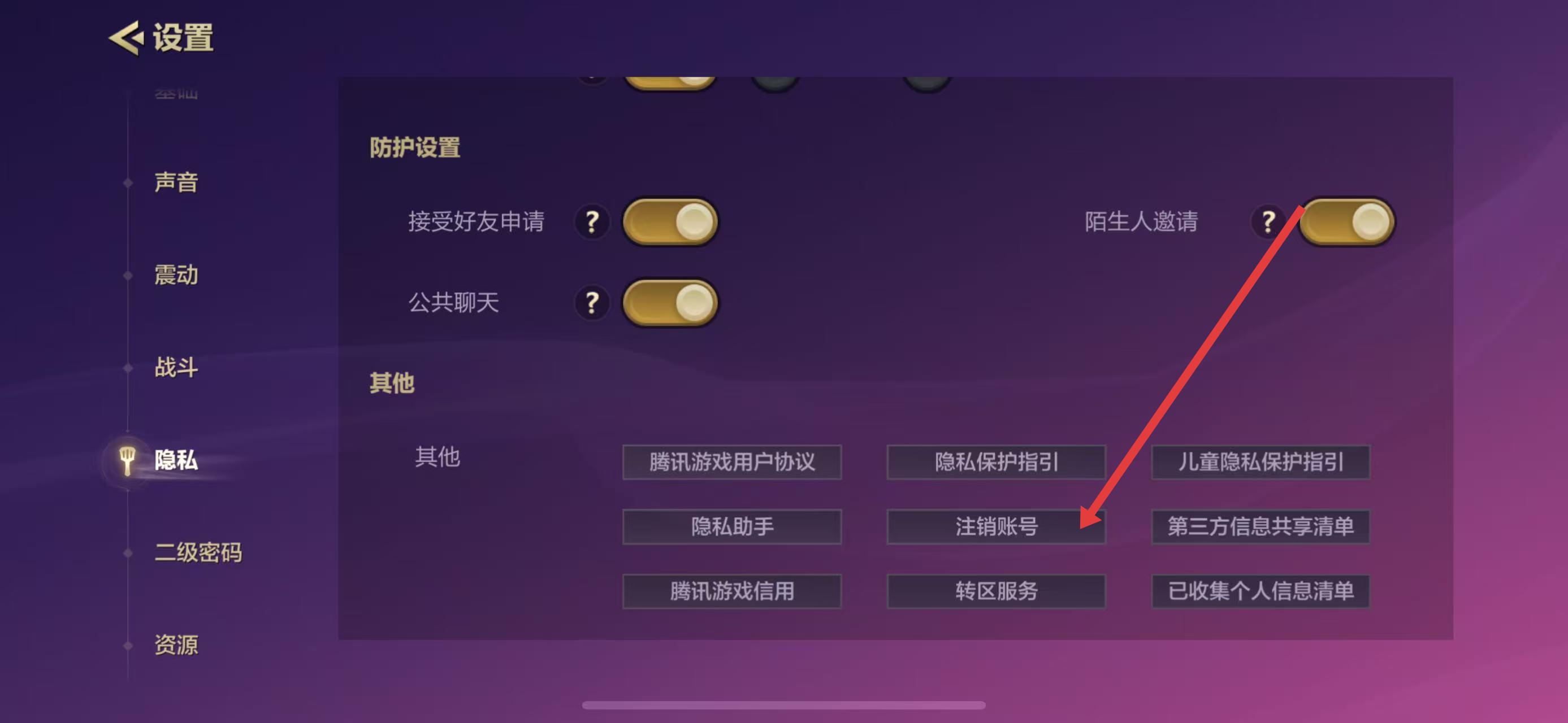 3、在隱私設(shè)置界面的下方“其他”板塊中,找到注銷賬號按鈕,點擊后按照后續(xù)提示進行身份驗證、確認賬號信息等操作,即可完成游戲賬號注銷。