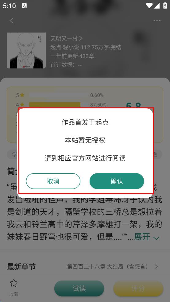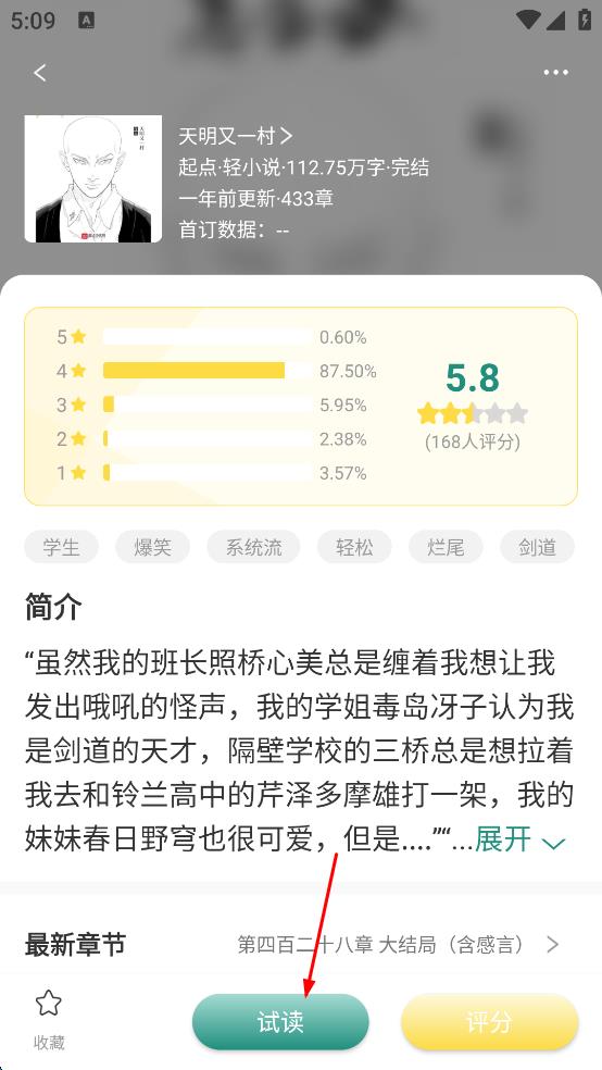 3、在小說詳情頁面,查看小說的基本信息,包括評分、簡介等內(nèi)容,然后點(diǎn)擊頁面下方的“試讀”按鈕。