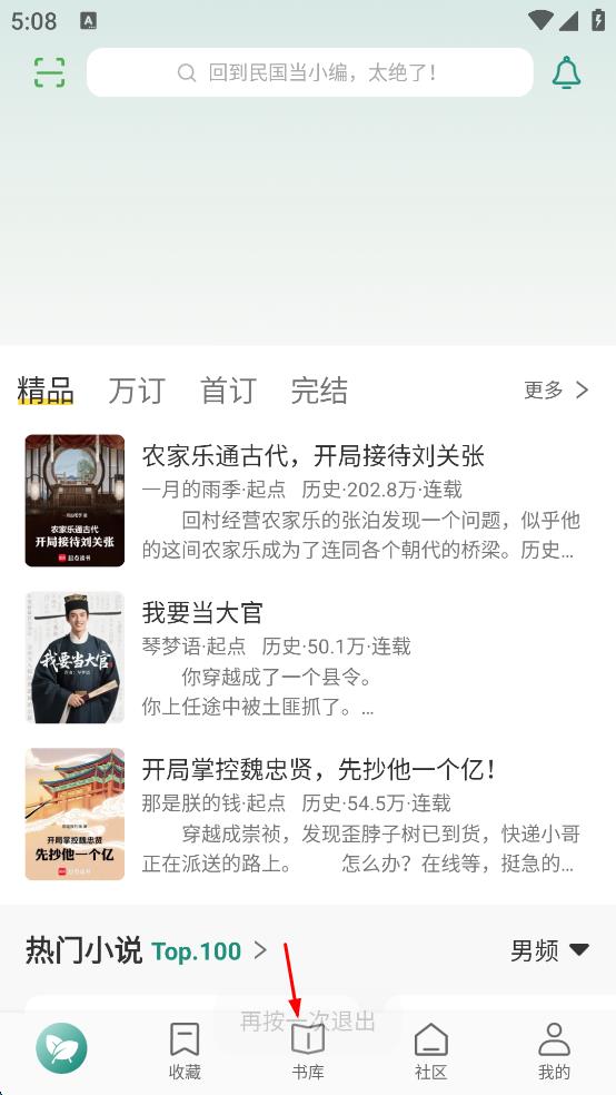 1、打開小說閱讀軟件,進(jìn)入首頁后,點(diǎn)擊頁面下方的“書庫”選項(xiàng),進(jìn)入書庫頁面。