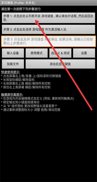 1、在進入到App中,需按步驟使用,點擊步驟1按鈕進行開啟游戲鍵盤。