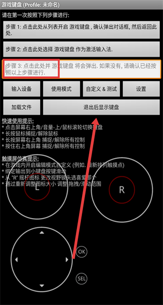 3、完成前面步驟后點擊步驟3區(qū)域,即可彈窗游戲鍵盤,再點擊退出后顯示鍵盤按鈕即可返回桌面。