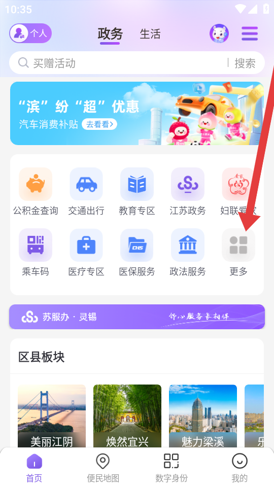 2、接著我們進(jìn)入app的政務(wù)頁(yè)面,需要點(diǎn)擊功能區(qū)的更多圖標(biāo),來(lái)進(jìn)行查看全量服務(wù)的選項(xiàng)。
