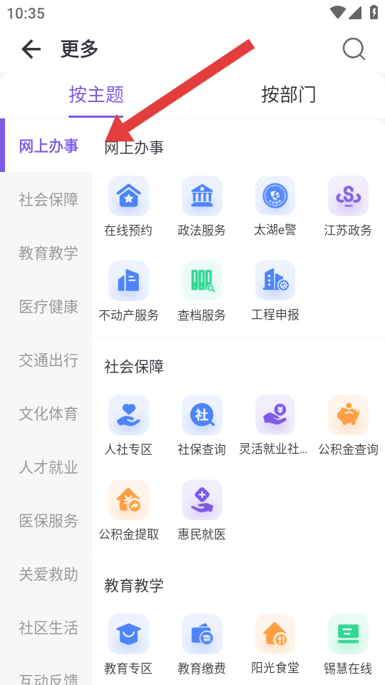 3、在更多的頁(yè)面,選擇按主題分類(lèi)下的網(wǎng)上辦事板塊,瀏覽在線預(yù)約、政法服務(wù)等辦事功能。
