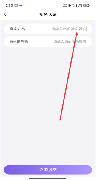 2、在實(shí)名認(rèn)證界面輸入真實(shí)姓名后,點(diǎn)擊立即提交按鈕。
