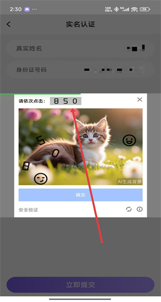 3、在提交實(shí)名認(rèn)證信息后,需完成安全驗(yàn)證依次點(diǎn)擊8、5、0。