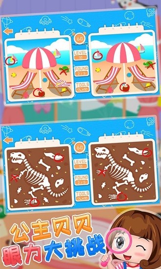 1、公主貝貝眼力大挑戰(zhàn)中玩家要用很短的時間去完成找茬,可以培養(yǎng)你的專注力.