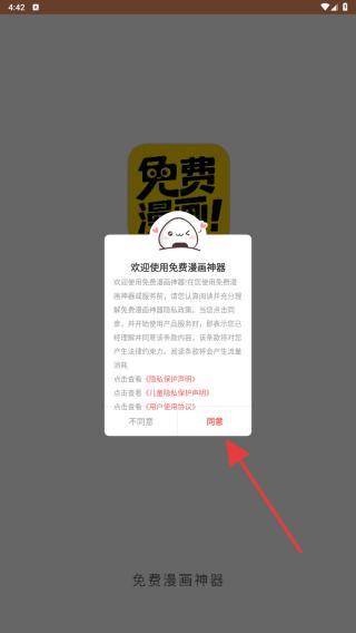 1、打開免費漫畫神器APP,進(jìn)入時會彈出歡迎語,點擊同意的按鈕。