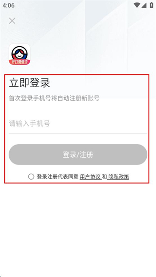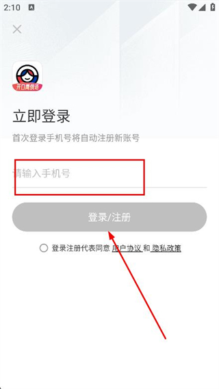 3、在登錄頁面,輸入手機(jī)號(hào),勾同意用戶協(xié)議和隱私政策,點(diǎn)擊登錄/注冊(cè)。