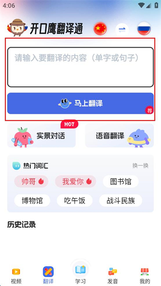 4、登錄后點(diǎn)擊翻譯,在翻譯頁面輸入要翻譯的內(nèi)容,點(diǎn)擊馬上翻譯即可使用翻譯功能。