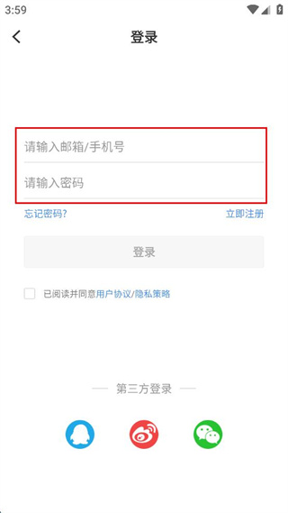 3、進(jìn)入登錄頁(yè)面,依次輸入郵箱/手機(jī)號(hào)、密碼。