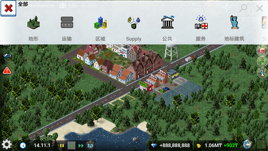默認模式下,每一個新建的城市區(qū)域都擁有不同于其他區(qū)域的游戲難度,但游戲同時也提供了不受資源束縛的自由建造模式;操作方面,theotown將建造功能(內置搜索功能)、拆除功能、查看視角、意外視角以及圖表單獨分離,游戲時我們可以有選擇的進行使用,總體還算直觀。
