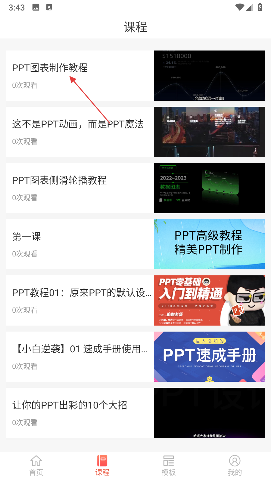 1、打開PPT制作軟件點(diǎn)擊底部課程選項(xiàng)進(jìn)入課程界面,瀏覽課程列表找到想要學(xué)習(xí)的課程。