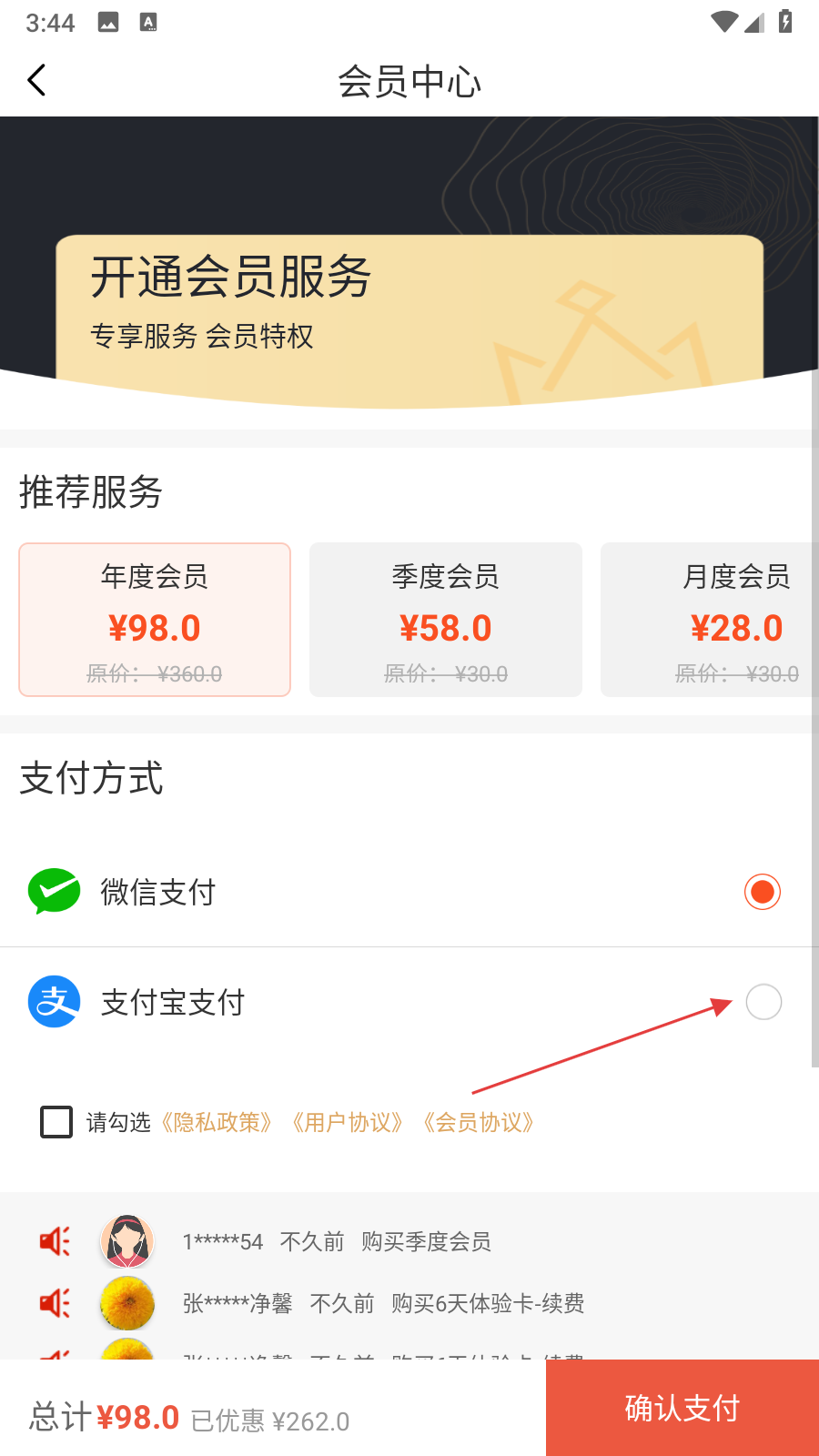 2、課程需會員權(quán)限才能觀看,點(diǎn)擊課程后會跳轉(zhuǎn)至?xí)T開通頁面,選擇支付寶支付等支付方式。
