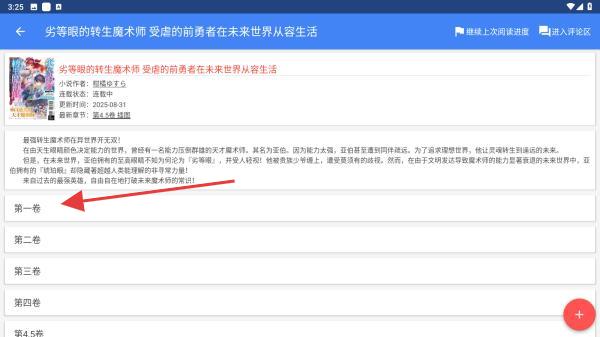 2、進(jìn)入小說詳情頁后,點(diǎn)擊目標(biāo)卷數(shù),展開該卷的章節(jié)列表。