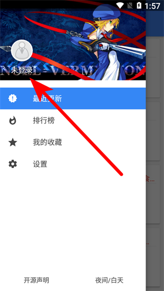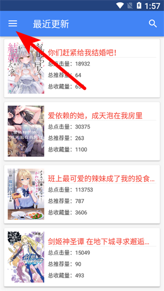 1、在輕小說文庫最近更新頁面,點(diǎn)擊左上角三橫線圖標(biāo),展開側(cè)邊菜單。