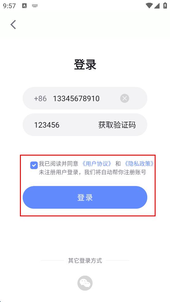 4、輸入完成后,勾選“我已閱讀并同意用戶協(xié)議和隱私政策,最后點(diǎn)擊“登錄”按鈕,即可完成驗(yàn)證碼登錄流程。