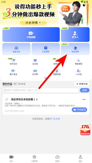 1、打開說(shuō)得AI APP,在首頁(yè)點(diǎn)擊智能消除,進(jìn)入智能消除功能頁(yè)面。