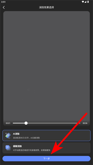 3、視頻導(dǎo)入后,進(jìn)入消除效果選擇頁(yè)面,選擇合適消除方式后點(diǎn)擊下一步。