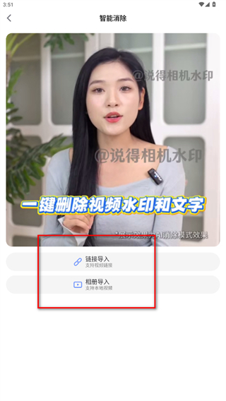 2、在智能消除頁(yè)面,選擇鏈接導(dǎo)入或相冊(cè)導(dǎo)入,添加需要處理的視頻。