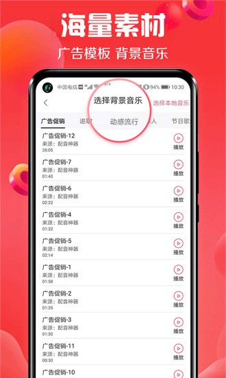 免費(fèi)廣告配音手機(jī)軟件通過簡單的素材合成,即可幫助你輕松制作出一個可以應(yīng)用在實際場景的配音廣告。在日常經(jīng)營活動中當(dāng)你遇到需要制作語音廣告時就可以借助該軟件來制作出不同風(fēng)格的趣味廣告,軟件內(nèi)提供了豐富模板,可由用戶任意使用。
