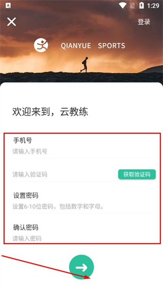 3、輸入手機(jī)號(hào)、驗(yàn)證碼,設(shè)置密碼并確認(rèn)密碼后,點(diǎn)擊綠色箭頭,完成賬號(hào)注冊(cè)。