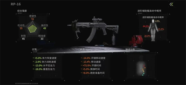 在改裝臺(tái)時(shí),可以點(diǎn)擊槍械強(qiáng)度詳情頁(yè)面查看優(yōu)劣屬性情況,同時(shí)右側(cè)會(huì)顯示這把槍在開啟進(jìn)階輔助瞄準(zhǔn)時(shí)的部位命中概率。如圖示,這把RP-16開啟進(jìn)階輔助瞄準(zhǔn)時(shí)頭部命中概率是1%,軀干64%,手臂15%,腿部20%。了解具體的數(shù)值才能更好發(fā)揮進(jìn)階輔助瞄準(zhǔn)的優(yōu)勢(shì)。