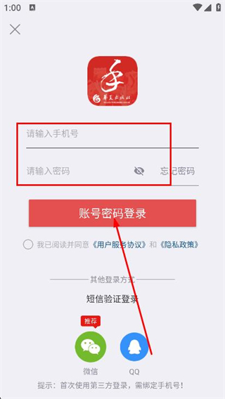 4、輸入手機(jī)號(hào)和密碼,點(diǎn)擊登錄按鈕即可完成登錄。