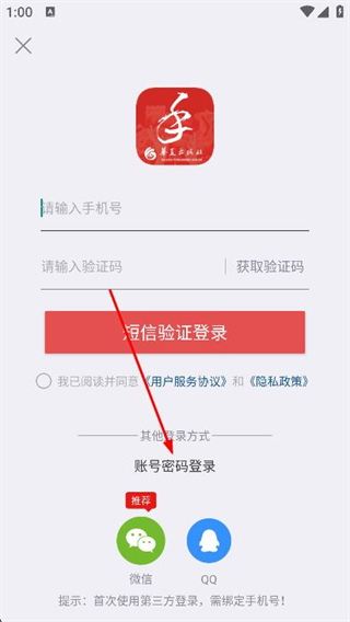 3、在登錄頁面,點(diǎn)擊下方的賬號(hào)密碼登錄選項(xiàng)。