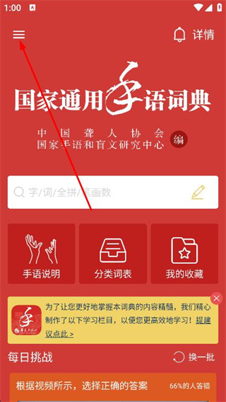 1、打開國家通用手語詞典,點(diǎn)擊左上角的菜單。