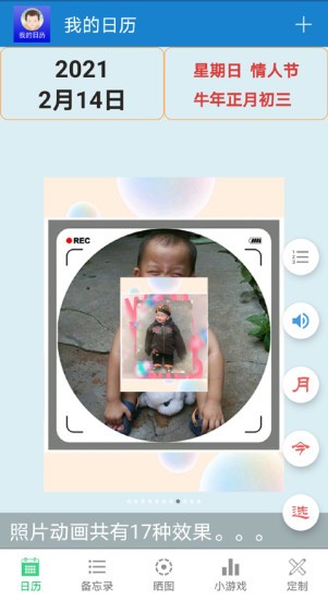 快速免費(fèi)定制,用自己的照片,幾分鐘制作出屬于自己的相冊日歷。日歷頁面中間是動畫相冊,有17種動畫效果,每次打開APP都不同,還可以選擇背景音樂。曬圖頁面有許多動圖看,小游戲頁面有許多小游戲鏈接,定制頁面有許多免費(fèi)圖書鏈接,都可以直接在應(yīng)用內(nèi)打開。每天簽到可以領(lǐng)積分,積分可以用于應(yīng)用內(nèi)支付。