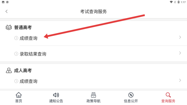 2、在考試查詢服務頁面中,點擊普通高考下的成績查詢按鈕,開始查詢成績。