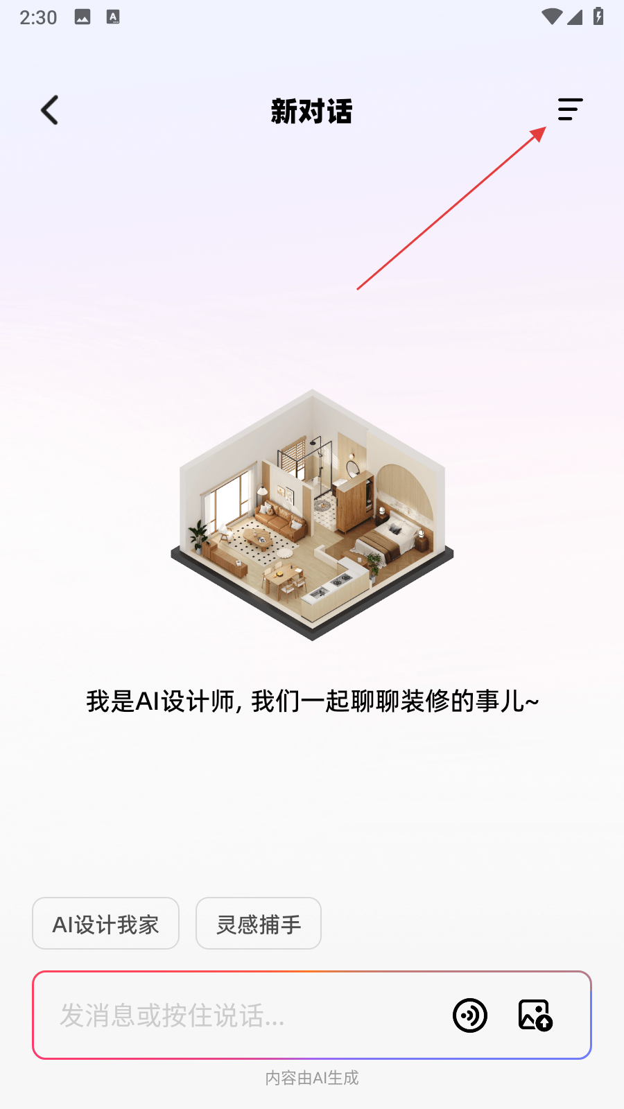 1、打開AI設計家軟件,點擊右上角三條橫杠,進入個人中心頁面。