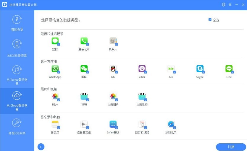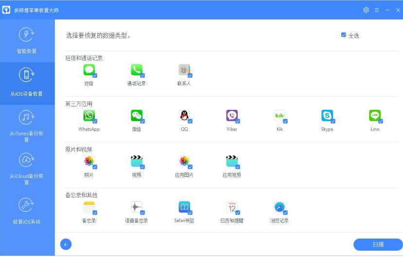 選擇需要恢復(fù)的數(shù)據(jù)類型,點(diǎn)擊“掃描”按鈕,軟件將開始從您的蘋果設(shè)備中搜索已經(jīng)被刪除的數(shù)據(jù)。