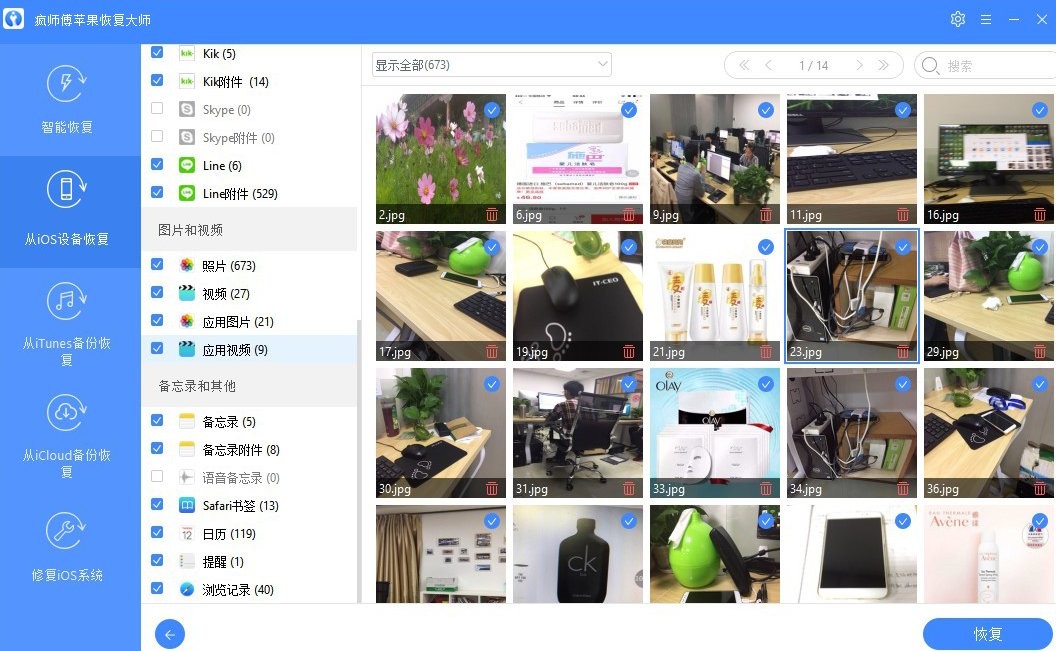 掃描完成后將顯示全部文件,請瀏覽所需文件,點(diǎn)擊“顯示全部(673)”右邊向下箭頭選擇“僅顯示已刪除的文件”進(jìn)行查看并選擇需要恢復(fù)的文件,點(diǎn)擊“恢復(fù)”即可。