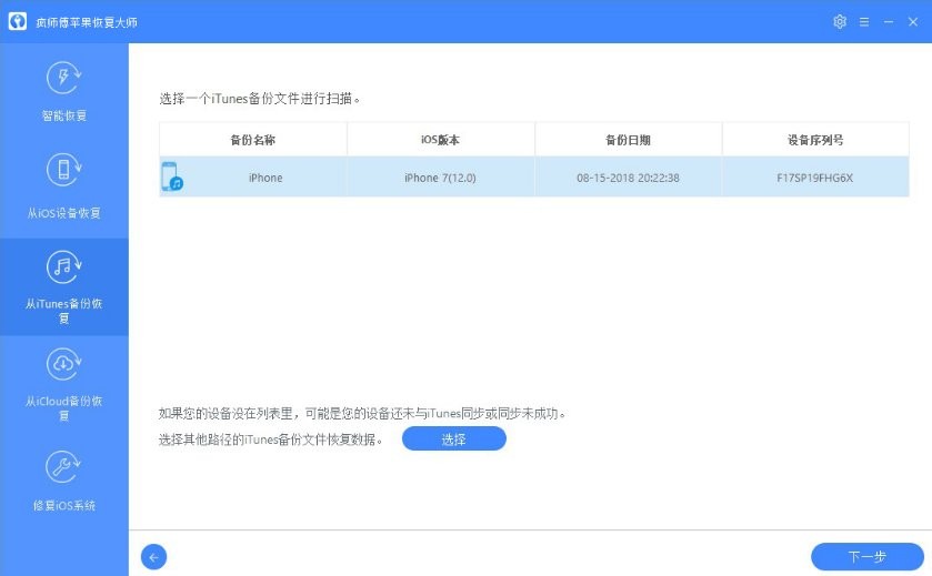 選擇需要恢復(fù)數(shù)據(jù)所在的iTunes備份,并點(diǎn)擊下一步。